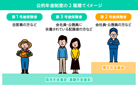 公的年金とは国が運営する年金全体のことで、社会保障制度の一つです。 現在公的年金は、「国民年金」と「厚生年金」の2種類に分けられています。 以下のように、公的年金は1階部分の国民年金と2階部分の厚生年金とで2階建てと呼ばれているのが特徴です。