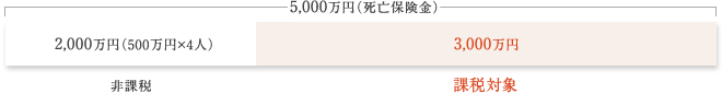 | 死亡保険金 | 法定相続人は妻と子供3人の計4人ですので、「500万円×4人=2,000万円」が非課税となります。 よって「5,000万円(死亡保険金)-2,000万円(非課税分)=3,000万円」が相続税の課税対象となります。 |