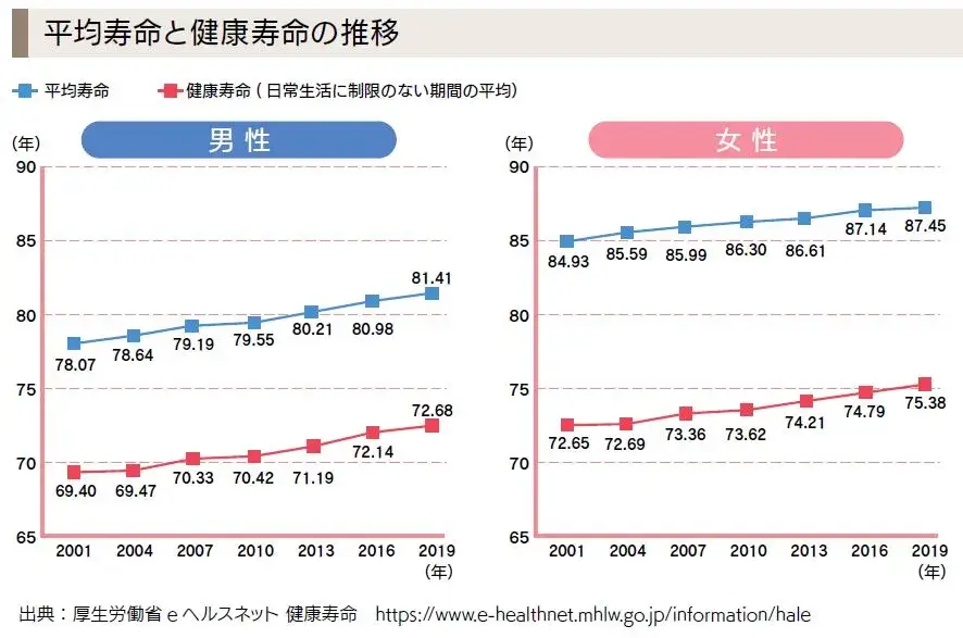 平均寿命と健康寿命の差に注目してみてみると、0歳における平均余命=平均寿命は男女ともに伸び続けています。