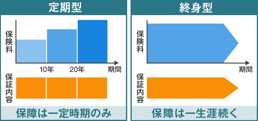 40代で医療保険を検討する際には保障期間と払込期間に注目し、自分に合うものを選択することもまた重要です。医療保険の保障期間(保障を受けられる期間)には、終身型と定期型の2種類があります。それぞれの概要と特徴は以下です。