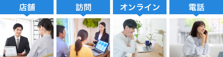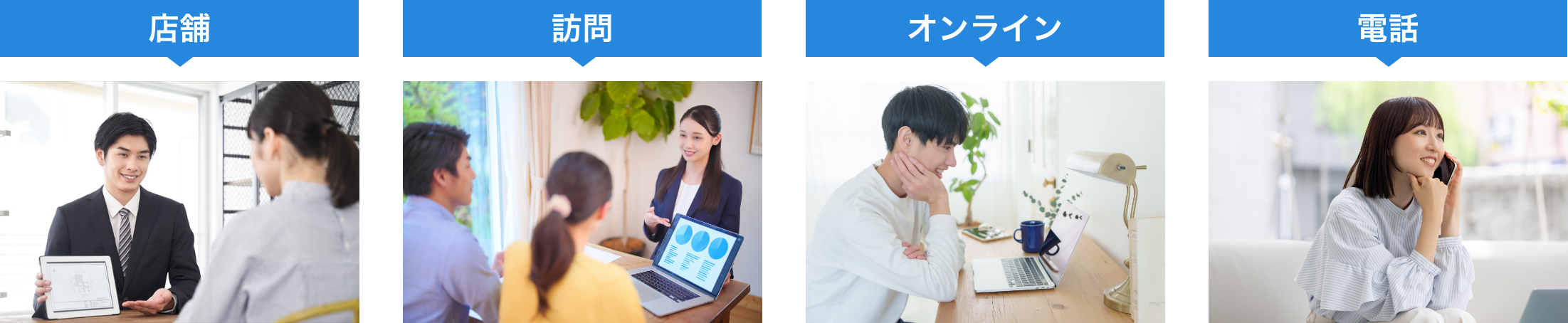ご予約の際に店舗、訪問、電話、オンラインの中からご希望の相談方法をお選びください。ご予約なく来店された際にはスムーズなご案内ができずご要望にお応えできない場合がありますので、予約優先の対応を取らせていただいております。ゆっくりとお話をお伺いするためにも、事前の相談予約がおすすめです。 -