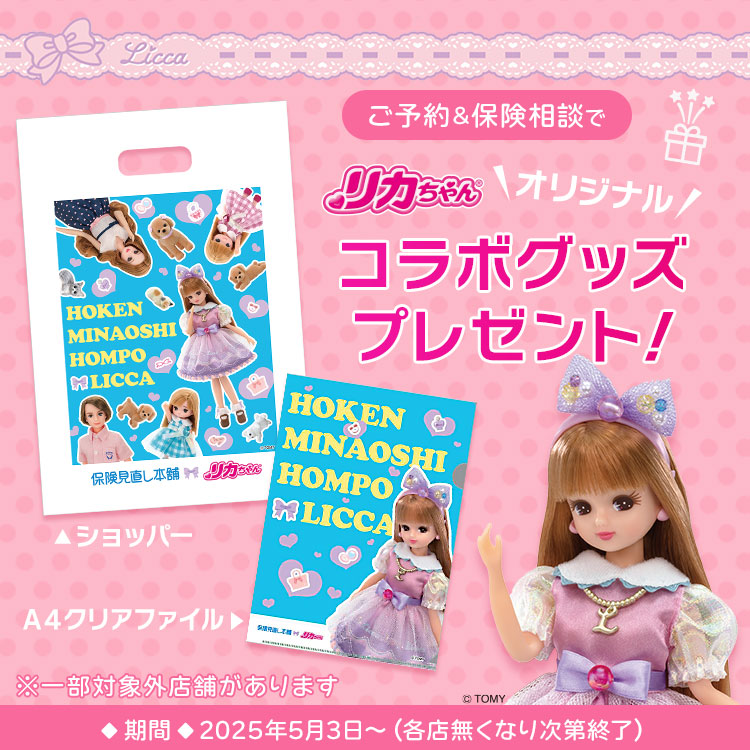 期間:2025年5月3日~(各店無くなり次第終了) 内容:「保険見直し本舗」のご利用が初めてで、専用フォームからのご予約&保険相談で、リカちゃんA4クリアファイル&ショッパーをプレゼント! スペシャルコラボ店舗とフォトスポット設置店舗では、リカちゃんパッケージに入って撮影できるフォトスポットを設置中!リカちゃんになりきって撮影しよう!★詳しくはコチラ » ※一部対象外店舗がございます。