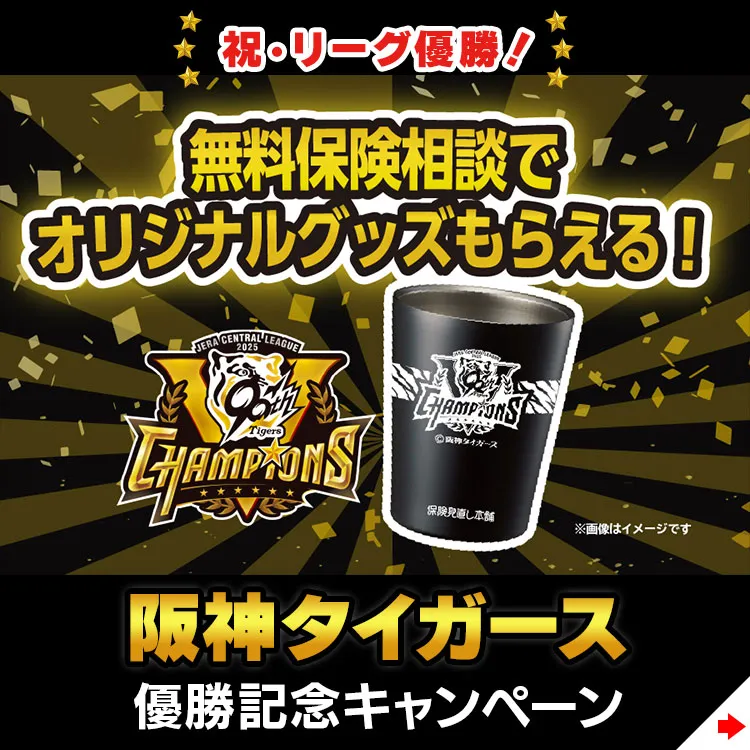 内容:「保険見直し本舗」にて初めて保険相談をされた方に、阪神タイガース リーグ優勝ロゴ入りタンブラーをプレゼント!