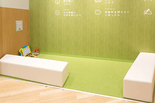 - 店内にキッズスペースを設け、お子さま連れの方が落ち着いて保険の相談ができるようにしています。