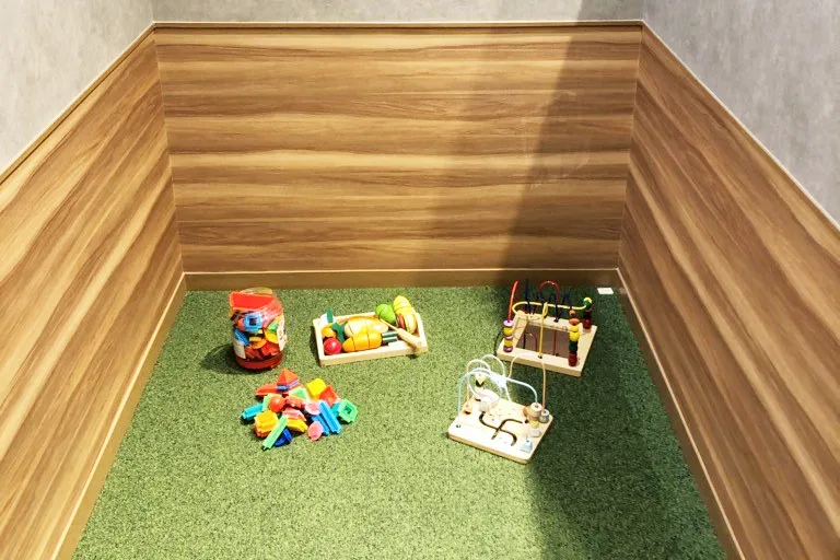 - 店内にキッズスペースを備え、お子さまが楽しく遊びながら保険相談の待ち時間を過ごせるようにしています。