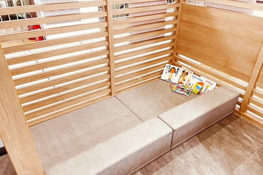 - 店内にキッズスペースを備え、お子さまが楽しく遊びながら保険相談の待ち時間を過ごせるようにしています。