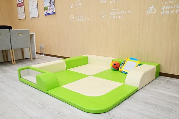 - 店内にキッズスペースを備え、お子さまが楽しく遊びながら保険相談の待ち時間を過ごせるようにしています。「子どもがいるから保険相談に行きづらい」とお悩みの方も、気兼ねなくご予約ください。