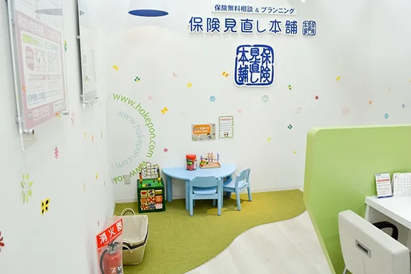 店内にキッズスペースを備え、お子さまが楽しく遊びながら保険相談の待ち時間を過ごせるようにしています。