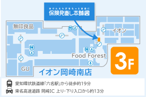 店舗は、愛知環状鉄道線「六名駅」から徒歩約19分の「イオン岡崎南店」内にございます。お車では、東名高速道路 岡崎IC 上り・下り入口から約13分でお越しいただけますので、どうぞご来店くださいませ。