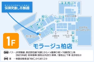 店舗は、JR常磐線、東武野田線「柏駅」4番乗り場[柏05系統] 若柴循環(香取台先回り)に乗車、香取台で下車し、徒歩約6分の「モラージュ柏」内にございます。