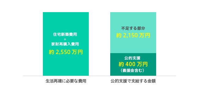 住宅が全壊し、家財も再購入する場合、生活の再建には単純な計算で2,550万円もの金額が必要になる反面、公的支援として期待できる金額は400万円と、必要な金額の6分の1に満たないことが分かります。