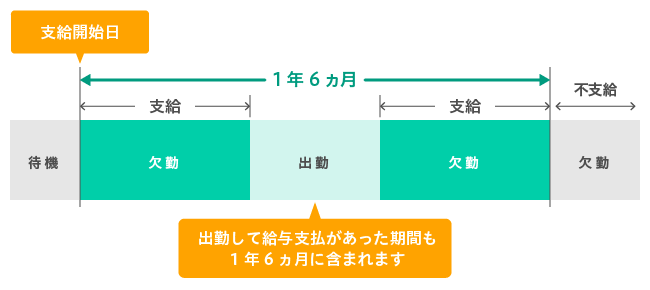 これは、1年6ヵ月分支給されるということではなく、1年6ヵ月の間に仕事に復帰した期間があり、その後再び同じ病気やケガにより仕事に就けなくなった場合でも、復帰期間も1年6ヵ月に算入されます。