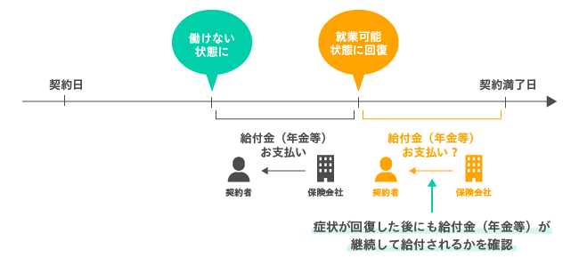 給付金継続給付の有無とは、一度お支払事由に該当し給付金が支払われたあとに、働けない状態から回復し職場復帰をしたとしても、一定期間継続して保険金が給付されるか否かになります。
