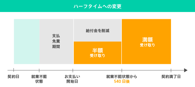 次にハーフタイプとは、就業不能状態になってから540日(1年6ヶ月相当)の間、設定した給付金額の半額をお支払するといった内容です。