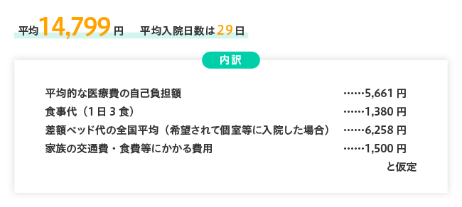 ※入院1日の医療費の自己負担分は、入院患者総数および傷病別の入院患者数の診療報酬点数および平均入院日数をもとに、初月に10日間入院したと仮定した場合の医療費(健康保険の自己負担割合3割)から、高額療養費(所得区分が標準報酬月額28~50万円の場合)を差し引いた金額[ 医療費5,661円(乳がんは7,889円、大腸がんは6,685円、骨折は4,467円、脳卒中は3,912円)]に、食事代及びその他の自己負担額を加算。実際の自己負担額はケースにより異なります。