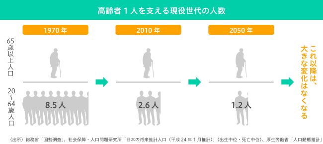 過去をさかのぼると、1970年には「8.5人で1人」を支えていましたが、2010年には「2.6人で1人」、2050年には「1.2人で1人」を支える見込みとなっています。