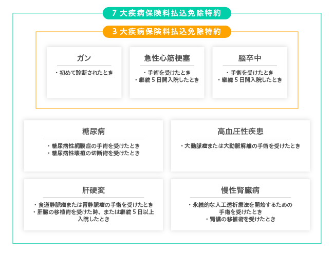 - 「3大疾病保険料払込免除特約」または「7大疾病保険料払込免除特約」を付加することができます。