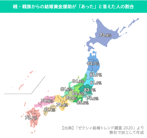 ゼクシィが行った調査によると、親・親族からの結婚資金援助に関する全国調査では、78.6%の人が「あった」と答えており、