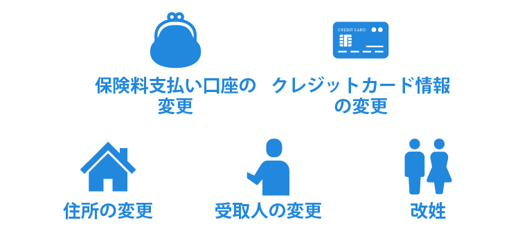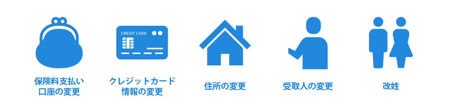 保険料の支払い口座を変更される場合は、変更の手続きが必要です。また、クレジットカード情報を変更される場合にも、変更手続きが必要です。